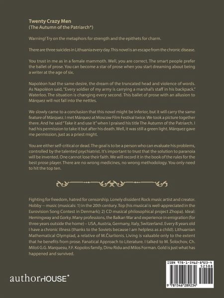 Twenty Crazy Men (The Autumn of the Patriarch*) Warning! Try on the metaphors for strength and the epithets for charm. There are three suicides in Lithuania every day. This novel is an escape from the chronic disease. You trust in me as in a female mammoth. Well, you are correct. The smart people prefer the ballet of prose. You can become a star of prose when you start dreaming about being a writer at the age of six. Napolon had the same desire, the dream of the truncated head and violence of words. As Napolon said, Every soldier of my army is carrying a marshals staff in his backpack. Waterloo. The situation is changing every second. This ballet of prose with an allusion to Mrquez will not fall into the nettles. We slowly came to a conclusion that this novel might be inferior, but it will carry the same feature of Mrquez. I met Mrquez at Moscow Film Festival twice. We took a picture together there. And he said Take it and use it when I praised his title The Autumn of the Patriarch. I had his permission to take it but after his death. Well, it was still a green light. Mrquez gave me permission, just as a priest might. You are either self-critical or dead. The goal is to be a person who can evaluate his problems, controlled by the talented psychiatrist. Its important to trust that the solution to paranoia will be invented. One cannot lose their faith. We will record it in the book of the rules for the best prose player. There are no wrong medicines, no wrong methodology. You only need to hit the top ten.