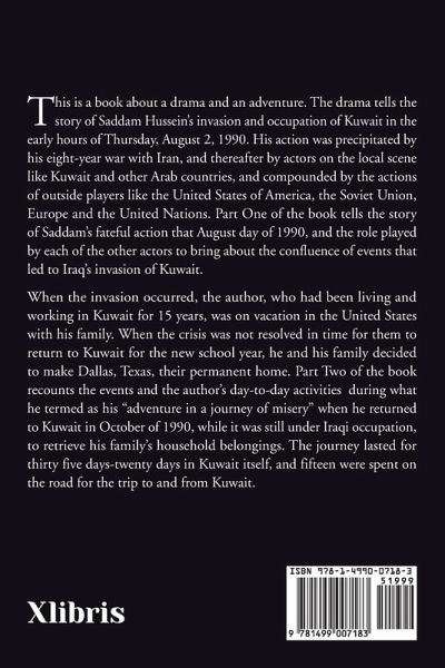 This is a book about a drama and an adventure. The drama tells the story of Saddam Hussein's invasion and occupation of Kuwait in the early hours of Thursday, August 2, 1990. His action was precipitated by his eight-year war with Iran, and thereafter by actors on the local scene like Kuwait and other Arab countries, and compounded by the actions of outside players like the United States of America, the Soviet Union, Europe and the United Nations. Part One of the book tells the story of Saddam's fateful action that August day of 1990, and the role played by each of the other actors to bring about the confluence of events that led to Iraq's invasion of Kuwait. When the invasion occurred, the author, who had been living and working in Kuwait for 15 years, was on vacation in the United States with his family. When the crisis was not resolved in time for them to return to Kuwait for the new school year, he and his family decided to make Dallas, Texas, their permanent home. Part Two of the book recounts the events and the author's day-to-day activities during what he termed as his "adventure in a journey of misery" when he returned to Kuwait in October of 1990, while it was still under Iraqi occupation, to retrieve his family's household belongings. The journey lasted for thirty five days-twenty days in Kuwait itself, and fifteen were spent on the road for the trip to and from Kuwait.