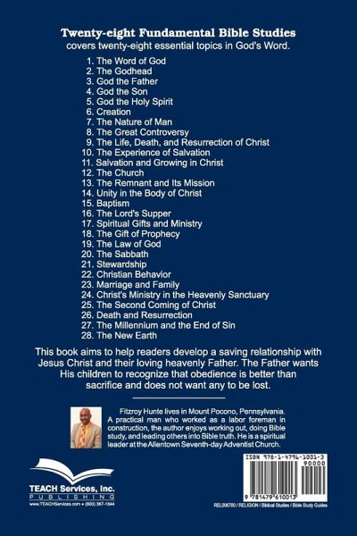 Twenty-eight Fundamental Bible Studies, by Fitzroy Hunte, is a handy summary of 28 Bible topics that are fundamental teachings of God’s Word. Each study begins with a teaching that tangibly connects us with the redemptive work of the Lord Jesus Christ. This book aims to help readers to develop a saving relationship with Jesus Christ and their loving heavenly Father. The Father wants His children to recognize that obedience is better than sacrifice and does not want any to be lost.