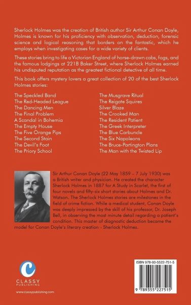 Sherlock Holmes was the creation of British author Sir Arthur Conan Doyle, Holmes is known for his proficiency with observation, deduction, forensic science and logical reasoning that borders on the fantastic, which he employs when investigating cases for a wide variety of clients. These stories bring to life a Victorian England of horse-drawn cabs, fogs, and the famous lodgings at 221B Baker Street, where Sherlock Holmes earned his undisputed reputation as the greatest fictional detective of all time. This book offers mystery lovers a great collection of 20 of the best Sherlock Holmes stories:The Speckled Band The Red-Headed League The Dancing Men The Final Problem A Scandal in Bohemia The Empty House The Five Orange Pips The Second Stain The Devil's Foot The Priory School The Musgrave Ritual The Reigate Squires Silver Blaze The Crooked Man The Resident Patient The Greek Interpreter The Blue Carbuncle The Six Napoleons The Bruce-Partington Plans The Man with the Twisted Lip