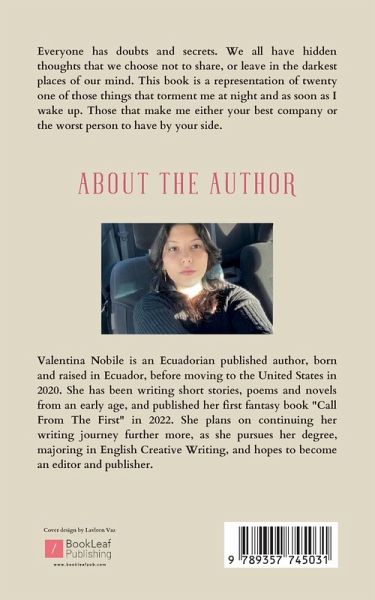 Everyone has doubts and secrets. We all have hidden thoughts that we choose not to share, or leave in the darkest places of our mind. This book is a representation of twenty one of those things that torment me at night and as soon as I wake up. Those that make me either your best company or the worst person to have by your side.