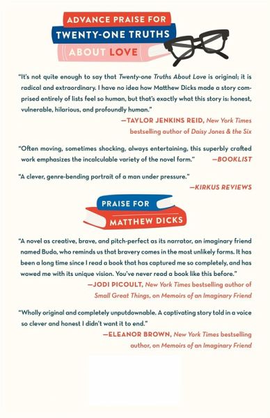 From the beloved author of Memoirs of an Imaginary Friend comes a wonderful new novel about a struggling man, written entirely in lists. Daniel Mayrock's life is at a crossroads. He knows the following to be true: 1. He loves his wife Jill... more than anything. 2. He only regrets quitting his job and opening a bookshop a little (maybe more than a little) 3. Jill is ready to have a baby. 4. The bookshop isn't doing well. Financial crisis is imminent. Dan doesn't know how to fix it. 5. Dan hasn't told Jill about their financial trouble. 6. Then Jill gets pregnant. This heartfelt story is about…mehr