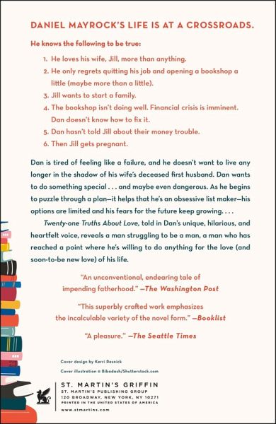 From Matthew Dicks, the author of Memoirs of an Imaginary Friend, comes Twenty-one Truths About Love, "an unconventional, endearing tale of impending fatherhood" (The Washington Post). Daniel Mayrock's life is at a crossroads. He knows the following to be true: 1. He loves his wife Jill... more than anything. 2. He only regrets quitting his job and opening a bookshop a little (maybe more than a little) 3. Jill is ready to have a baby. 4. The bookshop isn't doing well. Financial crisis is imminent. Dan doesn't know how to fix it. 5. Dan hasn't told Jill about their financial trouble. 6. Then Jill gets pregnant. This heartfelt story, written entirely in lists, is about the lengths one man will go to and the risks he will take to save his family. But Dan doesn't just want to save his failing bookstore and his family's finances: 1. Dan wants to do something special. 2. He's a man who is tired of feeling ordinary. 3. He's sick of feeling like a failure. 4. He doesn't want to live in the shadow of his wife's deceased first husband. Dan is also an obsessive list maker; his story unfolds entirely in his lists, which are brimming with Dan's hilarious sense of humor, unique world-view, and deeply personal thoughts. When read in full, his lists paint a picture of a man struggling to be a man, a man who has reached a point where he's willing to do anything for the love (and soon-to-be new love) of his life.