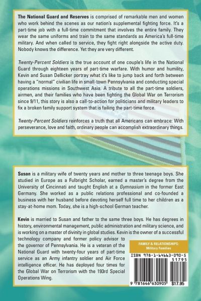 ". . . a poignant reminder that our freedom still depends on 'twenty-percent soldiers' who volunteer to protect and defend our nation when duty calls." -Tom Ridge43rd Governor of Pennsylvania, First US Secretary of Homeland Security The National Guard and Reserves is comprised of remarkable men and women who work behind the scenes as our nation's supplemental fighting force. It's a part-time job with a full-time commitment that involves the entire family. They wear the same uniforms and train to the same standards as America's full-time military. And when called to service, they fight right alongside the active duty. Nobody knows the difference. Yet they are very different. Twenty-Percent Soldiers is the true account of one couple's life in the National Guard through eighteen years of part-time warfare. With humor and humility, Kevin and Susan Dellicker portray what it's like to jump back and forth between having a "normal" civilian life in small-town Pennsylvania and conducting special operations missions in Southwest Asia. A tribute to all the part-time soldiers and their families who have been fighting the Global War on Terrorism since 9/11, this story is also a call-to-action for politicians and military leaders to fix a broken family support system that is failing the part-time force. Twenty-Percent Soldiers reinforces a truth that all Americans can embrace: With perseverance, love and faith, ordinary people can accomplish extraordinary things.