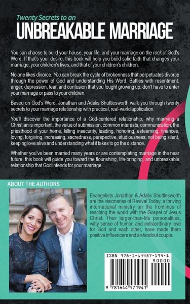 "Two are better off than one, for they can help each other succeed." ~ Ecclesiastes 4:9 You can choose to build your house, your life, and your marriage on the rock of God's Word. If that's your desire, this book will help you build solid faith that changes your marriage, your children's lives, and that of your children's children. No one likes divorce. You can break the cycle of brokenness that perpetuates divorce through the power of God and understanding His Word. Battles with resentment, anger, depression, fear, and confusion that you fought growing up don't have to enter your marriage or pass to your children. Based on God's Word, Jonathan and Adalis Shuttlesworth walk you through twenty secrets to your marriage relationship with practical, real-world application. You'll discover the importance of a God-centered relationship, why marrying a Christian is important, the value of submission, common interests, communication, the priesthood of your home, killing insecurity, leading, honoring, esteeming, finances, loving, forgiving, increasing, sacredness, perspective, studiousness, not being silent, keeping love alive and understanding what it takes to go the distance. Whether you've been married many years or are contemplating marriage in the near future, this book will guide you toward the flourishing, life-bringing, and unbreakable relationship that God intends for your marriage. About the Authors: Evangelists Jonathan and Adalis Shuttlesworth are the visionaries of Revival Today, a thriving international ministry on the frontlines of reaching the world with the Gospel of Jesus Christ. Their larger-than-life personalities, witty sense of humor and extraordinary love for God and each other have made them positive influencers and a standout couple. In 2007, Jonathan and Adalis co-founded and launched Revival Today. Presently, their ministry continues its global impact through the Revival Today App and 24-hour radio, conferences, outdoor crusades, daily social media programming, live streaming, podcasts, devotionals, and Revival Today Global Broadcast. As the distinguished authors of Financial Overflow, Dominion Over Sickness & Disease, The Mighty Series Children's Books, and now Twenty Secrets to an Unbreakable Marriage, they are committed to empowering others to live victoriously in every area of life.