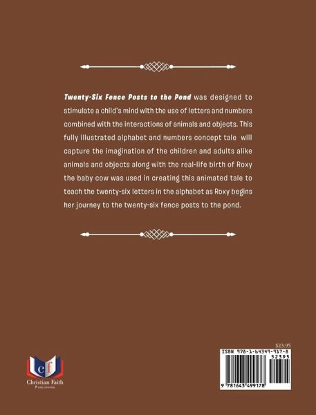 Twenty-Six Fence Posts to the Pond was designed to stimulate a child's mind with the use of letters and numbers combined with the interactions of animals and objects. This fully illustrated to concept alphabet and letters tale will capture the imagination of the children and adults alike animals and objects along with the real-life birth of Roxy the baby cow was used in creating this animated tale to teach the twenty-six letters in the alphabet as Roxy begins her journey to the twenty-six fence posts to the pond.