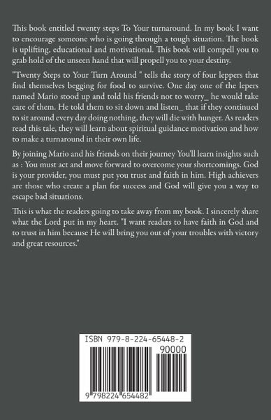 This book entitled twenty steps To Your turnaround. In my book I want to ecourage someone who is going through a tough situation. The book is uplifting, educational and motivationalthis book will compell you to grab hold of the unseen handthat will propell you to your destiny. "Twenty Steps to Your Turn around " tells the story of four leppersthat find themselves begging for food to survive . One day on of the lepers named mariostood up and told his friends not to worry_ he would take care of them. He told them to sit down and listen_ that if they continued to sit around , they would die. As readers read this tale, they will learn aboutspiritual guidance motivation and how to make a turnaround in their own life. By joining Mario and his friends on their journey You'll learn insights such as : You must act and move forward to overcome your shortcomingsGord is your provider, you must put you trust and faith in him. high achievers are those who create a plan for success and God will give you a way to escape bad situations. This is what the readers going to take away from my book. I sincerely share what the Lord put in my heart. "I want readers to have faith in God and to trust in him because He will bring you out of your troubles with victory and great resources."