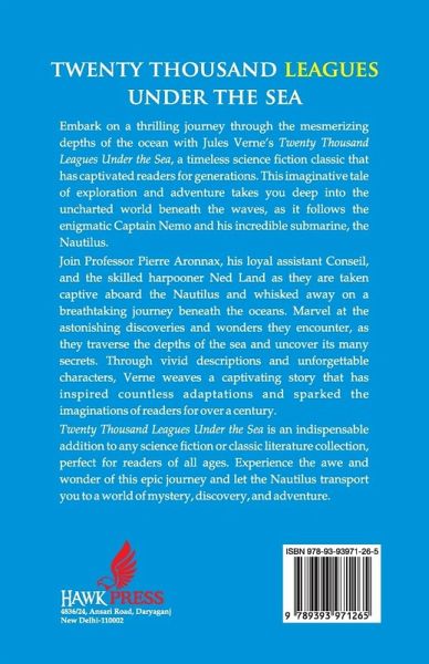 Embark on a thrilling journey through the mesmerizing depths of the ocean with Jules Verne's Twenty Thousand Leagues Under the Sea, a timeless science fiction classic that has captivated readers for generations. This imaginative tale of exploration and adventure takes you deep into the uncharted world beneath the waves, as it follows the enigmatic Captain Nemo and his incredible submarine, the Nautilus.Join Professor Pierre Aronnax, his loyal assistant Conseil, and the skilled harpooner Ned Land as they are taken captive aboard the Nautilus and whisked away on a breathtaking journey beneath the oceans. Marvel at the astonishing discoveries and wonders they encounter, as they traverse the depths of the sea and uncover its many secrets. Through vivid descriptions and unforgettable characters, Verne weaves a captivating story that has inspired countless adaptations and sparked the imaginations of readers for over a century.Twenty Thousand Leagues Under the Sea is an indispensable addition to any science fiction or classic literature collection, perfect for readers of all ages. Experience the awe and wonder of this epic journey and let the Nautilus transport you to a world of mystery, discovery, and adventure.