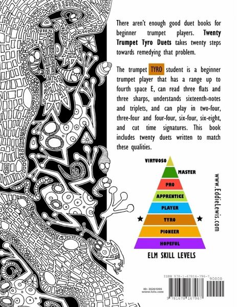 Twenty Trumpet Tyro Duets is a sequel to our Twenty Trumpet Pioneer Duets. The trumpet duets in this book cover a range up to fourth space E and are written in up to three flats and three sharps. There are twenty duets in this book, but some of the duets have as many as three different versions. Counting all the different versions, there are thirty-four duets in the book. The different version of each duet help the students comprehend the theory behind the music. They learn the music theory by playing it on their instruments. These Trumpet Tyro duets make great trumpet lesson assignments. They are not meant to be sight-read by Trumpet Tyro level students. For sight-reading materials for students at the Trumpet Tyro level, we recommend the Twenty Trumpet Pioneer Duets book.