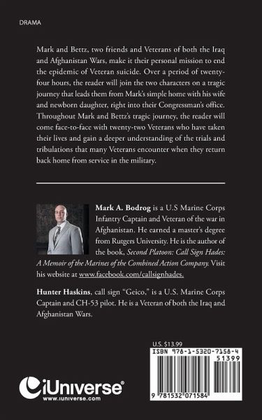 Mark and Bettz, two friends and Veterans of both the Iraq and Afghanistan Wars, make it their personal mission to end the epidemic of Veteran suicide. Over a period of twenty-four hours, the reader will join the two characters on a tragic journey that leads them from Mark's simple home with his wife and newborn daughter, right into their Congressman's office. Throughout Mark and Bettz's tragic journey, the reader will come face-to-face with twenty-two Veterans who have taken their lives and gain a deeper understanding of the trials and tribulations that many Veterans encounter when they return back home from service in the military.
