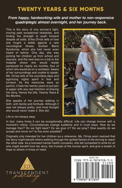 From happy, hardworking wife and mother to non-responsive quadriplegic almost overnight, and her journey back. This is the story of one woman's fight, moving past exceptional obstacles, and finding the strength to push forward despite all odds. Erika Orriss tells of how she fought a battle against a rare neurological illness, Guillain Barre Syndrome, which she had never even heard of before. One day, she was picking her children up from school and daycare, and the next was on a trip to the hospital where she would reside paralyzed for nearly six months, four of which she would be on a ventilator. Aware of her surroundings and unable to speak, Ms. Orriss tells of the countless days and agonizing nights spent in fear and torment. As the memories were so painful, it took her twenty years to put pen to paper with any real intention of sharing her story. Hence the title, Twenty Years & Six Months. She speaks of her journey walking in faith, with family and fortitude. Although it was not always pretty, and most thought she would never make it. She did. Life is not always easy. In fact, many times it can be exceptionally difficult. Life can change forever with a moment's notice. Circumstances change suddenly and in cruel ways. How do we manage then? Do we fight back? Do we give in? Do we pray? How exactly do we accept and move on? Is this even possible? Originally only intended for her children as a reference, Ms. Orriss soon realized that her story might benefit others walking through the ignited flames of life striving to reach the other side. As a licensed mental health counselor, she felt compelled to write for all who might benefit from her story, the triumph of the human spirit, and give a breath of hope to others in times of need.