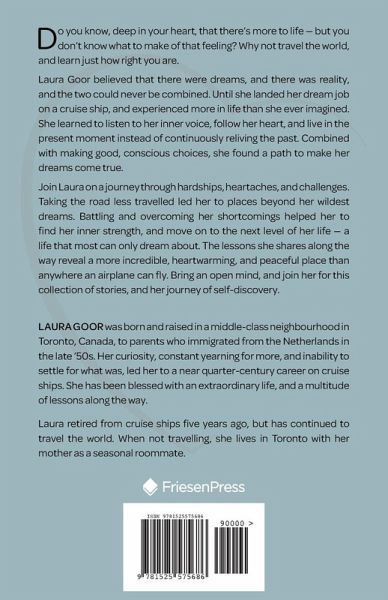 Do you know, deep in your heart, that there's more to life - but you don't know what to make of that feeling? Why not travel the world, and learn just how right you are. Laura Goor believed that there were dreams, and there was reality, and the two could never be combined. Until she landed her dream job on a cruise ship, and experienced more in life than she ever imagined. She learned to listen to her inner voice, follow her heart, and live in the present moment instead of continuously reliving the past. Combined with making good, conscious choices, she found a path to make her dreams come true. Join Laura on a journey through hardships, heartaches, and challenges. Taking the road less travelled led her to places beyond her wildest dreams. Battling and overcoming her shortcomings helped her to find her inner strength, and move on to the next level of her life- a life that most can only dream about. The lessons she shares along the way reveal a more incredible, heartwarming, and peaceful place than anywhere an airplane can fly. Bring an open mind, and join her for this collection of stories, and her journey of self-discovery.