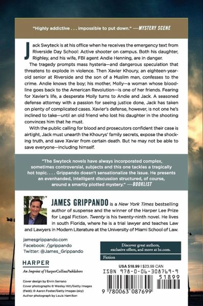 Jack Swyteck and his family are caught in the crossfire after a deadly school shooting claims twenty casualties?Florida's fifth mass shooting in as many years?in this provocative and timely thriller from Harper Lee Prize?winner James Grippando that touches on some of the most contentious issues roiling America today. It is the message every parent of a school-age child fears: ?Active Shooter on Campus.? Jack Swyteck is at his office when he receives the emergency text from Riverside Day School. Both his daughter, Righley, and his wife, FBI agent Andie Henning, are in danger. Andie is in the school's rec center when she hears the fire alarms, then loud popping noises and screams coming from the hallway. A trained law-enforcement officer, Andie knows she's supposed to stay locked down inside the room. But Righley is in her kindergarten classroom and Andie must get her to safety. The tragedy prompts mass hysteria?and dangerous speculation. The police haven't identified the shooter, but they find a handgun on the school grounds registered to a parent, a Muslim man named Amir Khoury. News of the gun and its owner leaks and quickly goes viral. Within minutes Al Qaeda claims responsibility. Andie is shocked?Amir is married to her friend, Lilly, a WASP whose bloodline goes back to the American Revolution. When Xavier, Amir and Lilly's oldest child and an eighteen-year-old senior at Riverside confesses to the crime, the local community's anti-Muslim fervor explodes to levels unseen since 9/11. Terrified for her son's life, Lilly asks Jack to step in. A seasoned defense attorney with a passion to see justice done, he's taken on plenty of complicated cases. Xavier's, however, is not one he's inclined to take?until an old friend who lost his daughter in the shooting tells him that he must. With the public calling for blood and prosecutors confident their case is air tight, Jack must unearth the Khourys' family secrets in order to expose the shocking truth and save his client from certain death. But he may not be able to save everyone?including himself.