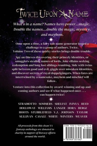 Double the name and double the magic, mystery, and mayhem Once upon a time, a fairy tale name generator issued a challenge to a group of authors. Volume Two of these quirky stories brings double trouble. In this clean YA anthology, spy on thieves discovering their princely identities, accompany villains seeking redemption along with accident-prone geese, and rejoice in the reunion of siblings separated at birth. Side with twins split between good and evil, giggle over mistaken identities, and discover the secrets of royal doppelgängers. When fates are intertwined by a namesake, mayhem and mischief are sure to follow. Venture into this collection of adventurous stories by award-winning and up-and-coming authors and see if what happens once . . . happens twice! Pssst...some characters from Once Upon A Name might make a comeback, but the two sets and all stories in them can be read as standalones. O TIME, UNTANGLE THIS by Susan Stradiotto and Sky Sommers SIREN SONG by Meadoe Hora THE LIES OF LADY ROSEBERRY by Alice Ivinya POISON QUEEN by R. S. Williams TO WALK IN ROYAL SHOES by Marie Reed BORN TO PROVE by Dani Hoots HIPPOLYTA GOES HUNTING by Alex Stubblefield THE TWIN AMBERS by Elena Shelest FOR OSIAN by Sarina Langer TO FIND A QUEEN by Sky Sommers A FEAST OF WILLS by Bekah Berge STAR DANCER by Astrid V.J. HAUNTING KING EZRA by Susan Stradiotto BLOODY MARY'S DAY OFF by Sophia-Rose Johnson IN THE FIERCE SHADOWS by Jo Holloway A POLITE THIEF by D.M. Taylor THE HUMMINGBIRD by CC Sullivan TERROR & TWILIGHT by N.D.T. Casale GAMES EGYPTIANS PLAY by Donna White ALLIE AND THE FOX by Eurelia Winters CURSED DESTINY by MS Weaver All proceeds donated to charity in support of reading and literacy.