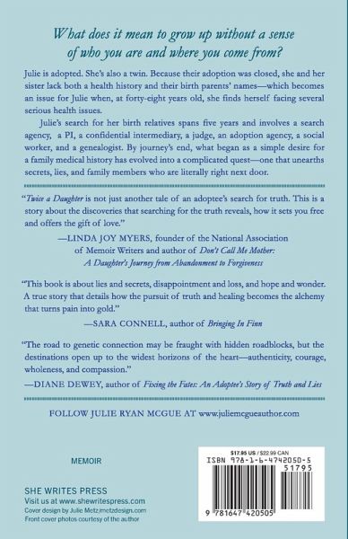 Julie is adopted. She is also a twin. Because their adoption was closed, she and her sister lack both a health history and their adoption papers--which becomes an issue for Julie when, at forty-eight years old, she finds herself facing several serious health issues. To launch the probe into her closed adoption, Julie first needs the support of her sister. The twins talk things over, and make a pact: Julie will approach their adoptive parents for the adoption paperwork and investigate search options, and the sisters will split the costs involved in locating their birth relatives. But their adoptive parents aren't happy that their daughters want to locate their birth parents--and that is only the first of many obstacles Julie will come up against as she digs into her background. Julie's search for her birth relatives spans eight years and involves a search agency, a PI, a confidential intermediary, a judge, an adoption agency, a social worker, and a genealogist. By journey's end, what began as a simple desire for a family medical history has evolved into a complicated quest--one that unearths secrets, lies, and family members that are literally right next door.
