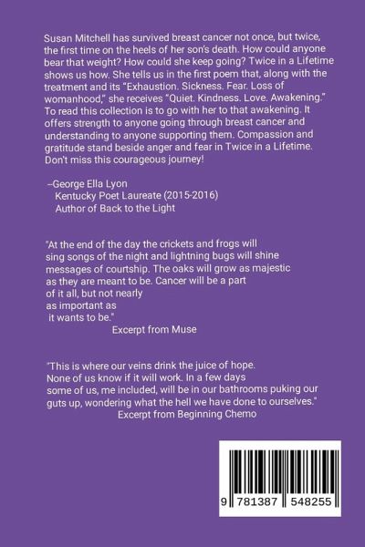 "You have cancer." Those are words no one wants to hear, especially not more than once. Twice in a Lifetime is a journey through cancer twice. Cancer is so much more than an illness. It is an opportunity to connect. From the devastating diagnosis to the poignant moments when life takes over and the human in all of us emerges. From support for anyone with cancer to understanding for those who love them, Twice in a Lifetime is a book to read, to digest, to experience more than once.