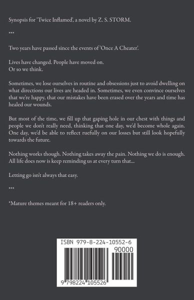 Synopsis for 'Twice Inflamed', a novel by Z. S. STORM. *** Two years have passed since the events of 'Once A Cheater'. Lives have changed. People have moved on. Or so we think. Sometimes, we lose ourselves in routine and obsessions just to avoid dwelling on what directions our lives are headed in. Sometimes, we even convince ourselves that we're happy, that our mistakes have been erased over the years and time has healed our wounds. But most of the time, we fill up that gaping hole in our chest with things and people we don't really need, thinking that one day, we'd become whole again. One day, we'd be able to reflect ruefully on our losses but still look hopefully towards the future. Nothing works though. Nothing takes away the pain. Nothing we do is enough. All life does now is keep reminding us at every turn that... Letting go isn't always that easy. *** *Mature themes meant for 18+ readers only.