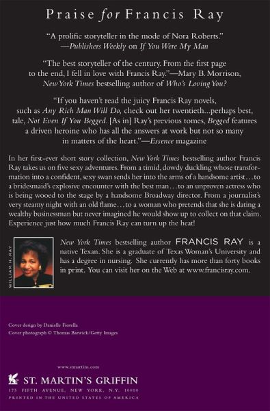 In this first ever short story collection, New York Times bestselling author Francis Ray takes us on five steamy, sexy adventures. From a timid, dowdy duckling who turns into a confident, sexy swan which sends her into the arms of a handsome artist to a bridesmaid's explosive encounter with the best man to an unproven actress who is being wooed to the stage by a handsome Broadway director. From a journalist's very steamy night with an old flame to a woman who pretends that she is dating a wealthy businessman but never imagines he would show up to collect on that claim. Experience just how much Francis Ray can turn up the heat!