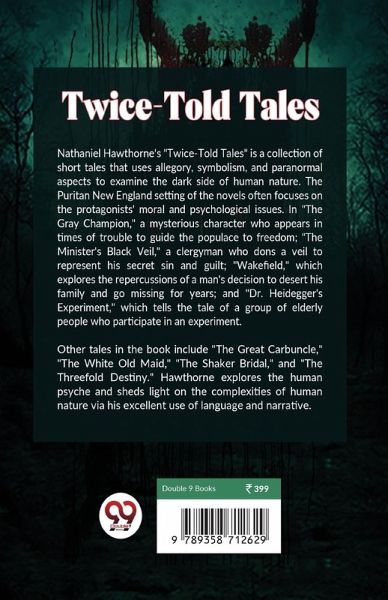Nathaniel Hawthorne's "Twice-Told Tales" is a collection of short tales that uses allegory, symbolism, and paranormal aspects to examine the dark side of human nature. The Puritan New England setting of the novels often focuses on the protagonists' moral and psychological issues. In "The Gray Champion," a mysterious character who appears in times of trouble to guide the populace to freedom; "The Minister's Black Veil," a clergyman who dons a veil to represent his secret sin and guilt; "Wakefield," which explores the repercussions of a man's decision to desert his family and go missing for years; and "Dr. Heidegger's Experiment," which tells the tale of a group of elderly people who participate in an experiment. Other tales in the book include "The Great Carbuncle," "The White Old Maid," "The Shaker Bridal," and "The Threefold Destiny." Hawthorne explores the human psyche and sheds light on the complexities of human nature via his excellent use of language and narrative.