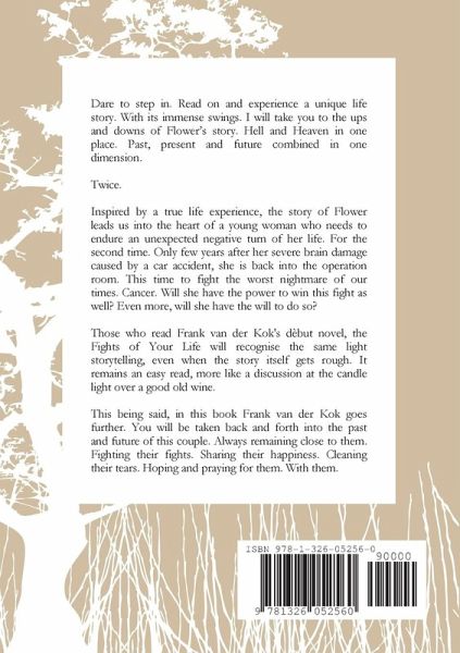 Hell and Heaven in one place. Past, present and future combined in one dimension. Twice. Inspired by a true life experience, the story of Flower leads us into the heart of a young woman who needs to endure an unexpected negative turn of her life. For the second time. Only few years after her severe brain damage caused by a car accident, she is back into the operation room. This time to fight the worst nightmare of our times. Cancer. Will she have the power to win this fight as well? Even more, will she have the will to do so? Those who read Frank van der Kok's dèbut novel, the Fights of Your Life will recognise the same light storytelling, even when the story itself gets rough. It remains an easy read, more like a discussion at the candle light over a good old wine. You will be taken back and forth into the past and future of this couple. Always remaining close to them. Fighting their fights. Sharing their happiness. Cleaning their tears. Hoping and praying for them. With them.