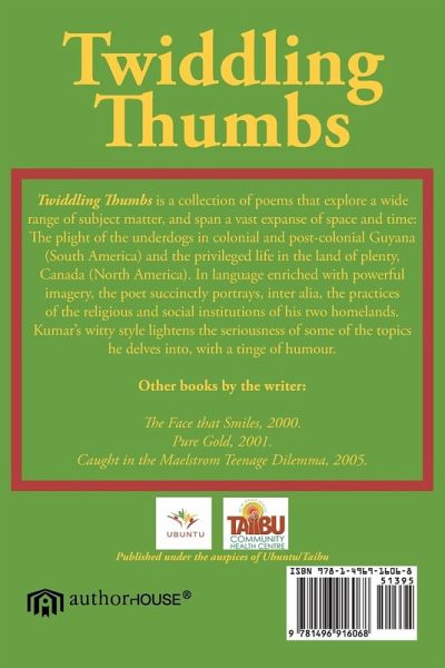 Twiddling Thumbs is a collection of poems that explore a wide range of subject matter, and span a vast expanse of space and time: The plight of the underdogs in colonial and post-colonial Guyana (South America) and the privileged life in the land of plenty, Canada (North America). In language enriched with powerful imagery, the poet succinctly portrays, inter alia, the practices of the religious and social institutions of his two homelands. Kumar's witty style lightens the seriousness of some of the topics he delves into, with a tinge of humour. Other books by the writer: The Face that Smiles, 2000. Pure Gold, 2001. Caught in the Maelstrom Teenage Dilemma, 2005.