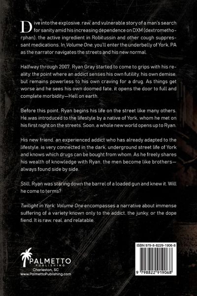 Dive into the explosive, raw, and vulnerable story of a man's search for sanity amid his increasing dependence on DXM (dextromethorphan), the active ingredient in Robitussin and other cough suppressant medications. In Volume One, you'll enter the underbelly of York, PA as the narrator navigates the streets and his new normal. In 2007, Ryan Gray was on and off the streets-living the last days of his existence as an active addict. He stayed in several halfway houses, had friends who were kind enough to let him sleep in their homes, and sometimes stayed at a nearby shelter. Volume One of his autobiographical narrative chronicles the events leading through the 'twilight' of his addiction, from meeting a native of York who became like a brother, to when Ryan began to inwardly sense his own futility, to making the choice to leave behind the middle-class life he knew. Twilight in York: Volume One is written in the style of Jack Kerouac, with a stream of consciousness effect as well as grammatical alterations. Heavy with explicit drug use, this read is best suited for adults. Though heavy and dark, Twilight in York, Volume One has a simple, easy-to-follow plot that appeals to the masses. Drug addicts, family and friends of addicts, homeless (and formerly homeless) people, and the mentally ill will resonate with Ryan's down-to-earth voice and relatable stories. This is more than an autobiography. This is a reality that many face when mental illness is pushed to the edges of society. Too many think, 'I want to help but not in my backyard,' that those suffering are forced onto the streets and forgotten about instead of receiving the help that they need. Luckily, Ryan Gray is still here to share his story and help bring a voice to those who are still struggling. Everyone who is of the age that they may be thinking about trying drugs should read this book. There is explicit content, but that adds to the importance of this message. -Randi-Lee Bowslaugh, Author This raw and truly gritty narrative will capture the reader in a ride through the eyes and mind of the addict. Ryan Gray's story left me uncomfortable at times in the best way; forcing me to open my eyes to a side of mental illness and addiction that only the author, or a true sufferer can understand. As a close family member of an addict, I believe this story will create a level of empathy for those recovering, others in the throes of sickness, the homeless and the mentally ill; whilst allowing the reader to draw their own conclusions based on their family situations and personal backgrounds. "Twilight in York: Volume 1" takes the Reader through a journey that leads to a place where you are invested and want more. This story of human experience, trials, tribulations and failures all culminate in the necessity of Volume 2 and I for one am looking forward to that. -Teresa Rosario-Hernandez, host of 'Prosecco Queens Podcast'