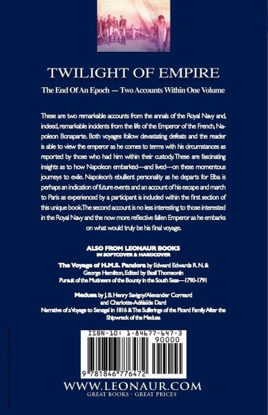 The end of an epoch-two accounts within one volume Narrative of Events by Sir Thomas Ussher Napoleon's Last Voyage: Extract of a diary by Sir George Cockburn These are two remarkable accounts from the annals of the Royal Navy and, indeed, remarkable incidents from the life of the Emperor of the French, Napoleon Bonaparte. Both voyages follow devastating defeats and the reader is able to view the emperor as he comes to terms with his circumstances as reported by those who had him within their custody. These are fascinating insights as to how Napoleon embarked-and lived-on these momentous…mehr