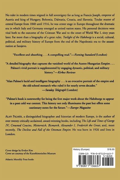 No ruler in modern times reigned in full sovereignty for as long as Francis Joseph emperor of Austria and king of Hungary, Bohemia, Dalmatia, Croatia, and Slavonia. Titular master of central Europe from 1848 until 1916, he was center stage in Europe throughout the dramatic era in which Italy and Germany emerged as united nation states. His personal decisions were vital both to the outcome of the Crimean War and to the onset of World War l, sixty years later. Although he was an autocrat who believed ill the Habsburg dynastic mission to provide eleven distinct nationalities with a cohesive unity, he was also a family man of simple tastes; and in his old age he was revered in his Austrian heartland, much as Queen Victoria was within her empire. Francis Joseph suffered a succession of personal disasters: his brother, Maximilian, was executed by Mexican republicans; his only son, Rudolf, shot himself and his mistress at Mayerling; his empress-queen Elizabeth, died from stab wounds in Geneva; his nephew and heir, Francis Ferdinand, was assassinated at Sarajevo. These episodes are examined anew by Alan Palmer in a biography of revelation, reassessment, and restoration. Too often the emperor is represented as a lonely, humorless bureaucrat, lacking in human warmth, artistic sensitivity, or political perception. Alan Palmer believes that this is a false impression. From a reading of hundreds of the emperor's letters, as well as his mother's diaries and other papers in the Vienna archives, Alan Palmer presents a more rounded and sympathetic portrait of Francis Joseph as the head of an empire and the head of a family. He has also used Elizabeth's curious verse journal, only recently made public, and the extensive writings of the controversial Crown Prince Rudolf in a reappraisal of the conflicting emotions that troubled the oldest of dynasties at a time of immense social, cultural, and political change for European society. Finally, Alan Palmer examines the durability of the Francis Joseph legend and its manifestation in republican Austria today.
