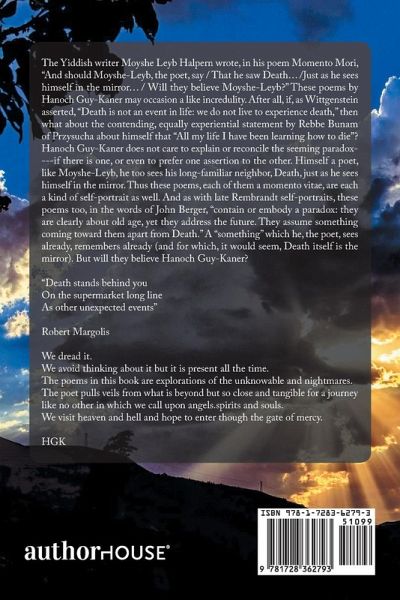 The Yiddish writer Moyshe Leyb Halpern wrote, in his poem Momento Mori, "And should Moyshe-Leyb, the poet, say / That he saw Death... /Just as he sees himself in the mirror... / Will they believe Moyshe-Leyb?" These poems by Hanoch Guy-Kaner may occasion a like incredulity. After all, if, as Wittgenstein asserted, "Death is not an event in life: we do not live to experience death," then what about the contending, equally experiential statement by Rebbe Bunam of Przysucha about himself that "All my life I have been learning how to die"? Hanoch Guy-Kaner does not care to explain or reconcile the seeming paradox----if there is one, or even to prefer one assertion to the other. Himself a poet, like Moyshe-Leyb, he too sees his long-familiar neighbor, Death, just as he sees himself in the mirror. Thus these poems, each of them a momento vitae, are each a kind of self-portrait as well. And as with late Rembrandt self-portraits, these poems too, in the words of John Berger, "contain or embody a paradox: they are clearly about old age, yet they address the future. They assume something coming toward them apart from Death." A "something" which he, the poet, sees already, remembers already (and for which, it would seem, Death itself is the mirror). But will they believe Hanoch Guy-Kaner? "Death stands behind you On the supermarket long line As other unexpected events" Robert Margolis We dread it. We avoid thinking about it but it is present all the time. The poems in this book are explorations of the unknowable and nightmares. The poet pulls veils from what is beyond but so close and tangible for a journey like no other in which we call upon angels.spirits and souls. We visit heaven and hell and hope to enter though the gate of mercy. HGK