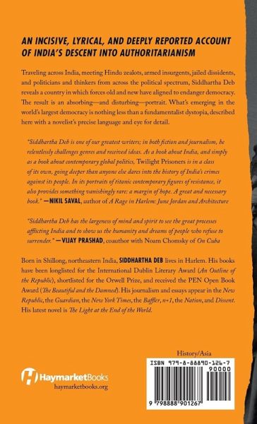 An incisive, lyrical, and deeply reported account of India’s descent into authoritarianism. Traveling across India, interviewing Hindu zealots, armed insurgents, jailed dissidents, and politicians and thinkers from across the political spectrum, Siddhartha Deb reveals a country in which forces old and new have aligned to endanger democracy. The result is an absorbing—and disturbing—portrait. India has become a religious fundamentalist dystopia, one depicted here with a novelist’s precise language and eye for detail. Prime Minister Narendra Modi and his party—a formation explicitly drawing on European fascism—has deftly exploited modern technologies, the media, and market forces to launch a relentless campaign on minorities, women, dissenters, and the poor. Deb profiles these people, as well as those fighting back, including writers, scholars, and journalists. Twilight Prisoners sounds the alarm now that the world’s largest democracy is under threat in ways that echo the fissures in the United States, United Kingdom, and so-called democracies the world over.