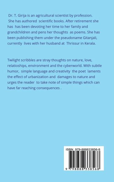 Twilight scribbles are stray thoughts on nature, love, relationships, our environment and the cyber world. With subtle humor, simple language and creativity the poet laments the effect of urbanization and damage to nature and urges the reader to take note of simple things which can have far-reaching consequences.