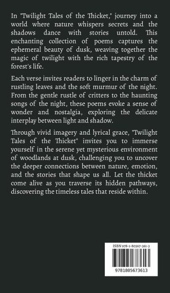 In "Twilight Tales of the Thicket," journey into a world where nature whispers secrets and the shadows dance with stories untold. This enchanting collection of poems captures the ephemeral beauty of dusk, weaving together the magic of twilight with the rich tapestry of the forest's life. Each verse invites readers to linger in the charm of rustling leaves and the soft murmur of the night. From the gentle rustle of critters to the haunting songs of the night, these poems evoke a sense of wonder and nostalgia, exploring the delicate interplay between light and shadow. Through vivid imagery and lyrical grace, "Twilight Tales of the Thicket" invites you to immerse yourself in the serene yet mysterious environment of woodlands at dusk, challenging you to uncover the deeper connections between nature, emotion, and the stories that shape us all. Let the thicket come alive as you traverse its hidden pathways, discovering the timeless tales that reside within.