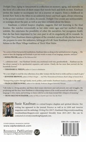 Twilight Time: Aging in Amazement is a reflection on memory, aging, and mortality in the form of a collection of short essays that travels back and forth in time. Kaufman invites the reader to accompany her on a journey of inquiry, from a childhood in Jewish New York in the fifties to an unknown future and back again, always returning to the present moment--its colors, its sounds. Twilight Time avoids any sentimentality or nostalgia about the past, as well as any false certainty about the future. Kaufman, a retired hospice chaplain, suggests that not knowing is the final frontier. She watches reverentially as her older sister ages and her mother's dying unfolds. She entertains the possibility of other life narratives, but recognizes finally that she has been imprinted by her own past in all its singularity, all its wounds. In Twilight Time, Kaufman shares a glimpse of the crowded canvas of who she has been as she prepares to enter the unknown, letting go of it all. Susie Kaufman practices mindfulness in the Plum Village tradition of Thich Nhat Hahn.
