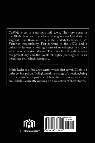 Twilight is set in a northern mill town. The story opens in the 1890s. A series of attacks on young women lead detective sergeant Rino Rossi into the sordid underbelly beneath late Victorian respectability. Fast forward to the 1970s and a university lecturer is leading a precarious existence in a town which is now in steep decline. There is a link though between the present day and the events of eighty years ago. It is an hereditary evil which corrupts.....
