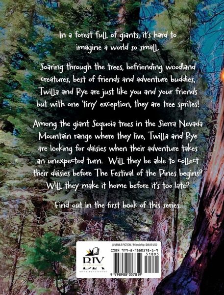 In a forest full of giants, it's hard to imagine a world so small. Soaring through the trees, befriending woodland creatures, best of friends, and adventure buddies, Twilla and Rye are just like you and your friends, but with one 'tiny' exception, they are tree sprites! Among the giant Sequoia trees in the Sierra Nevada Mountain range where they live, Twilla and Rye are looking for daisies when their adventure takes an unexpected turn. Will they be able to collect their daisies before The Festival of the Pines begins? Will they make it home before it's too late? Find out in the first book of this series.