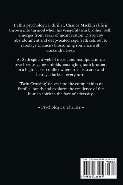 In the psychological thriller, the internet's virtual world sets the stage for a high-stakes game of deception and betrayal. Chance Macklin is ensnared in a web of lies spun by his vengeful twin, Seth, which jeopardizes his budding romance with Cassandra Grey. Seth's thirst for vengeance intensifies, fueled by perceived abandonment during his incarceration, putting Chance's very existence at risk. Amidst the chaos, young Brad Genova emerges as a steadfast ally, offering unwavering loyalty and hope. Together, Chance and Brad embark on a perilous journey to protect Cassandra and uncover the chilling secrets of Seth's troubled past. Exploring mental illness, family bonds, and human resilience, this suspenseful story keeps you guessing until the very end.
