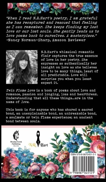 N.R.Hart's whimsical romantic flair captures the true essence of love in her poetry. She authentically expresses her insight on love as she believes love to be many things, least of all predictable. Love will surprise you when you least expect it. Twin Flame Love is a book of poems about love and romance, passion and longing, loss and heartbreak. Understanding that all these things...are in the name of love. This book is for anyone who has shared a sacred bond, an unexplainable bond, an unbreakable bond, a soulmate or twin flame experience; an ancient bond between souls.