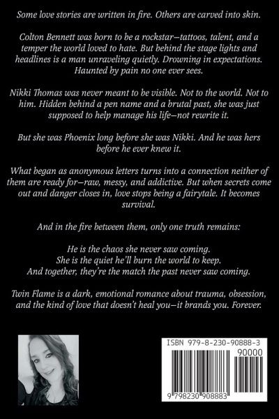 He's the chaos she never saw coming. She's the fire he never learned to put out. Nikki Thomas wasn't supposed to fall for the man she worked for-especially not when he's the same rock star she's been secretly writing to for years. As Phoenix, she was Colton Bennett's anchor in the dark. But now? She's the woman he can't stay away from... and the truth between them is a fuse waiting to blow. Colton lives in the spotlight. Loud, ruthless, and untouchable. But behind the fame is a man unraveling-and Nikki is the only one who sees the cracks. The only one who makes him feel anything real. Their connection is magnetic. Addictive. Dangerous. But love this deep doesn't come without scars. And when the past resurfaces with a vengeance, they'll be forced to face the Some flames were never meant to burn out. Twin Flame is a dark, emotional romance about trauma, obsession, and the kind of love that doesn't heal you-it brands you. Forever.
