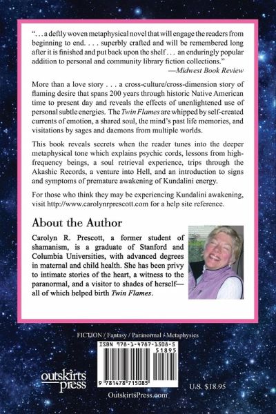 "...deftly woven...superbly crafted." ---Midwest Book Review Twin Flames reveals secrets when the reader tunes into the deeper metaphysical tone which explains psychic cords, lessons from high-frequency beings, a soul retrieval experience, trips through the Akashic records, a venture into Hell, and an introduction into signs and symptoms of premature awakening of Kundalini energy. For those who think they may be experiencing Kundalini awakening, visit http://www.carolynprescott.com for a help site reference.