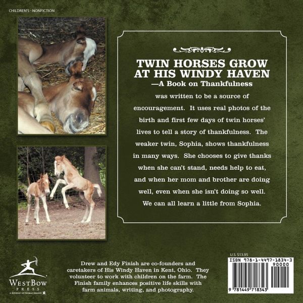 Twin Horses Grow at His Windy Haven-A Book on Thankfulness was written to be a source of encouragement. It uses real photos of the birth and first few days of twin horses' lives to tell a story of thankfulness. The weaker twin, Sophia, shows thankfulness in many ways. She chooses to give thanks when she can't stand, needs help to eat, and when her mom and brother are doing well, even when she isn't doing so well. We can all learn a little from Sophia.