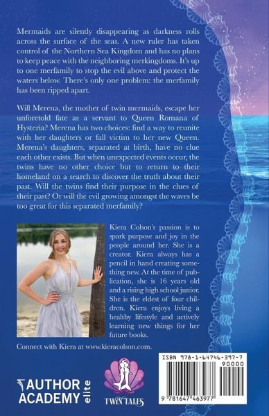 Mermaids are silently disappearing as darkness rolls across the surface of the seas. A new ruler has taken control of the Northern Sea Kingdom and has no plans to keep peace with the neighboring merkingdoms. It's up to one merfamily to stop the evil above and protect the waters below. There's only one problem: the merfamily has been ripped apart. Will Merena, the mother of twin mermaids, escape her unforetold fate as a servant to Queen Romana of Hysteria? Merena has two choices: find a way to reunite with her daughters or fall victim to her new Queen. Merena's daughters, separated at birth, have no clue each other exists. But when unexpected events occur, the twins have no other choice but to return to their homeland on a search to discover the truth about their past. Will the twins find their purpose in the clues of their past? Or will the evil growing amongst the waves be too great for this separated merfamily?