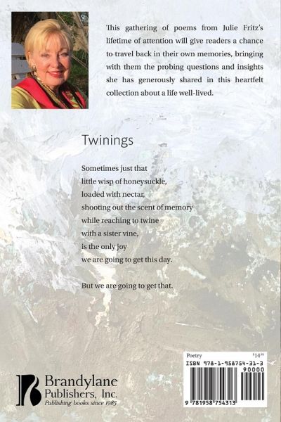 This gathering of poems from Julie Fritz's lifetime of attention will give readers a chance to travel back in their own memories too, bringing with them the probing questions and insights she has generously shared in this heartfelt collection about a life well-lived. ¿¿To Calm Cattle It takes skill to calm cattle. First, find fresh, tasseling alfalfa, blow its pollen toward the oldest mother, the one who has been open for three years but still yearns for birth and will listen to you. The sun needs to be high, when the meadowlarks are napping and before the red-tail circles. Get closer, breathe toward her ear but breathe softly - she knows what sorrow you carry and will let go her fear to keep you from the edge, to keep you calm.