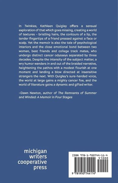 In Twinkies, Kathleen Quigley offers a sensual exploration of that which goes missing, creating a world of textures -- bristling hairs, the contours of a lip, the tender fingertips of a friend pressed against a face or scalp. Yet the memoir is also the tale of psychological interiors and the close emotional bond between two women, best friends and college track mates, who undergo distinct cancer odysseys separated by three decades. Despite the intensity of the subject matter, a wry humor wanders in and out of the braided narrative, heightening the pathos with a modest flourish at one moment and landing a blow directed at insensitive strangers the next. With Quigley's sure-handed voice, the world at large gains a mighty cancer foe, and the world of literature gains a dynamic and gifted writer.Dawn Newton, author of The Remnants of Summer and Winded: A Memoir in Four Stages