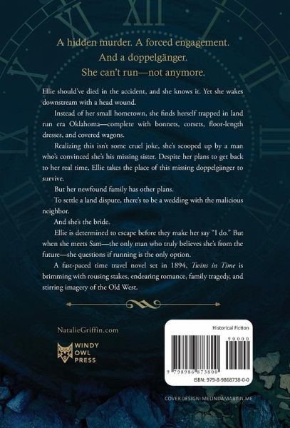 A hidden murder. A forced engagement. And a doppelgänger. She can't run-not anymore. Ellie should've died in the accident, and she knows it. Yet she wakes downstream with a head wound. Instead of her small hometown, she finds herself trapped in land run era Oklahoma-complete with bonnets, corsets, floor-length dresses, and covered wagons. Realizing this isn't some cruel joke, she's scooped up by a man who's convinced she's his missing sister. Despite her plans to get back to her real time, Ellie takes the place of this missing doppelgänger to survive. But her newfound family has other plans. To settle a land dispute, there's to be a wedding with the malicious neighbor. And she's the bride. Ellie is determined to escape before they make her say "I do." But when she meets Sam-the only man who truly believes she's from the future-she questions if running is the only option. A fast-paced time travel novel set in 1894, Twins in Time is brimming with rousing stakes, endearing romance, family tragedy, and stirring imagery of the Old West.