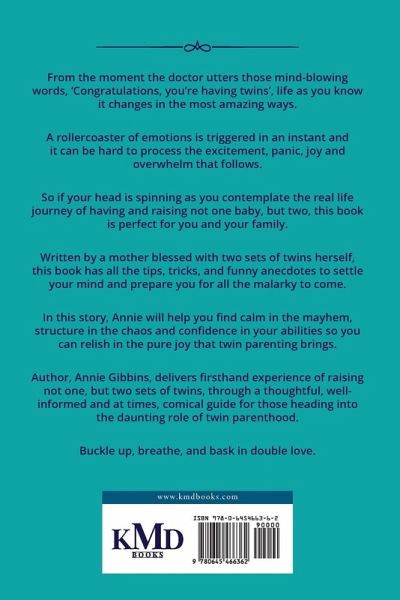 From the moment the doctor utters those mind-blowing words, "Congratulations, you're having twins", life as you know it changes in the most amazing ways. A rollercoaster of emotions is triggered in an instant and it can be hard to process the excitement, panic, joy and overwhelm that follows. So if your head is spinning as you contemplate the real life journey of having and raising not one baby, but two, this book is perfect for you and your family. Written by a mother blessed with two sets of twins herself, this book has all the tips, tricks, and funny anecdotes to settle your mind and prepare you for all the malarky to come. In this story, Annie will help you find calm in the mayhem, structure in the chaos and confidence in your abilities so you can relish in the pure joy that twin parenting brings. Author, Annie Gibbins, delivers firsthand experience of raising not one, but two sets of twins, through a thoughtful, well-informed and at times, comical guide for those heading into the daunting role of twin parenthood.