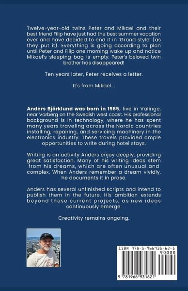 Twelve-year-old twins Peter and Mikael and their best friend Filip have just had the best summer vacation ever and have decided to end it in 'Grand style' (as they put it). Everything is going according to plan until Peter and Filip one morning wake up and notice Mikael's sleeping bag is empty. Peter's beloved twin brother has disappeared! Ten years later, Peter receives a letter. It's from Mikael... Anders Björklund was born in 1965, live in Valinge, near Varberg on the Swedish west coast. His professional background is in technology, where he has spent many years traveling across the Nordic countries installing, repairing, and servicing machinery in the electronics industry. These travels provided ample opportunities to write during hotel stays. Writing is an activity Anders enjoy deeply, providing great satisfaction. Many of his writing ideas stem from his dreams, which are often unusual and complex. When Anders remember a dream vividly, he documents it in prose. Anders has several unfinished scripts and intend to publish them in the future. His ambition extends beyond these current projects, as new ideas continuously emerge.