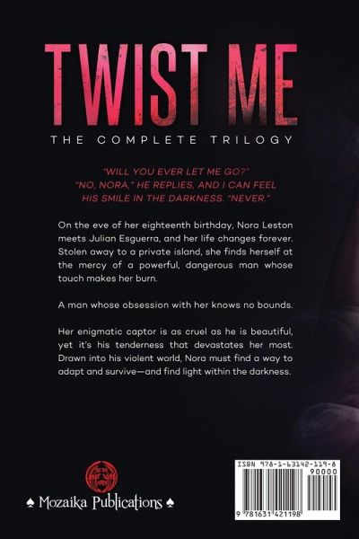 All 3 books in the New York Times bestselling trilogy, available for the first time in one convenient, discounted bundle. "Will you ever let me go?" "No, Nora," he replies, and I can feel his smile in the darkness. "Never." On the eve of her eighteenth birthday, Nora Leston meets Julian Esguerra, and her life changes forever. Stolen away to a private island, she finds herself at the mercy of a powerful, dangerous man whose touch makes her burn. A man whose obsession with her knows no bounds. Her enigmatic captor is as cruel as he is beautiful, yet it's his tenderness that devastates her most. Drawn into his violent world, Nora must find a way to adapt and survive-and find light within the darkness. Over 1000 5-star reviews across individual books. Here's what readers are saying: ¿ "So enthralling, gripping, raw, thrilling, breathtaking I could not put my Kindle down" ¿ "Twists you into gut wrenching agony and fear and turns you into a writhing mass of need" ¿ "I enjoyed this book with fear and arousal, amazed by the beauty in its darkness" ¿ "This series will forever be burned into my heart. I loved it from the very first page and mourned the last page because I never wanted it to end." ¿ "This trilogy deserves 10 stars!" ¿ "Utterly brilliant"