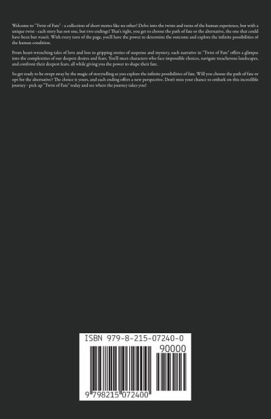 Welcome to "Twist of Fate" - a collection of short stories like no other! Delve into the twists and turns of the human experience, but with a unique twist - each story has not one, but two endings! That's right, you get to choose the path of fate or the alternative, the one that could have been but wasn't. With every turn of the page, you'll have the power to determine the outcome and explore the infinite possibilities of the human condition. From heart-wrenching tales of love and loss to gripping stories of suspense and mystery, each narrative in "Twist of Fate" offers a glimpse into the complexities of our deepest desires and fears. You'll meet characters who face impossible choices, navigate treacherous landscapes, and confront their deepest fears, all while giving you the power to shape their fate. So get ready to be swept away by the magic of storytelling as you explore the infinite possibilities of fate. Will you choose the path of fate or opt for the alternative? The choice is yours, and each ending offers a new perspective. Don't miss your chance to embark on this incredible journey - pick up "Twist of Fate" today and see where the journey takes you!