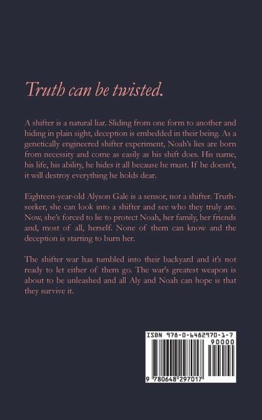 Truth can be twisted. A shifter is a natural liar. As a genetically engineered shifter experiment, Noah's lies are born from necessity and come as easily as his shift does. His name, his life, his ability, he hides it all because he must. If he doesn't, it will destroy everything he holds dear. Eighteen-year-old Alyson Gale is a sensor, not a shifter. Truth-seeker, she can look into a shifter and see who they truly are. Now, she's forced to lie to protect Noah, her family, her friends and, most of all, herself. None of them can know and the deception is starting to burn her. The shifter war has tumbled into their backyard and it's not ready to let either of them go. The war's greatest weapon is about to be unleashed and all Aly and Noah can hope is that they survive it.