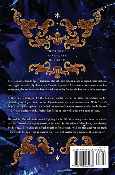 THREE GIRLS. THREE LIVES. ONE BOND. After almost a decade apart, Cammie, Hannah, and Sabina never expected their paths to cross again so suddenly. But when Cammie is plagued by memories of a person she has never met, she has no choice but to reach out to the friends she lost touch with years ago. A charismatic stranger-by the name of Caelan-claims he holds the answers to her mounting list of questions. Instead, Cammie winds up in a comatose state. With Caelan's help, Sabina races against time to find the man in Cammie's memories who holds the key to an unseen world... before her friend is lost within her own mind forever. Meanwhile, Hannah finds herself fighting for her life after being thrust into the middle of a war between beings rumored to be myth. In the midst of the chaos, one element holds true... fate pulled them back together for a reason. Will the trio uncover the truth they seek? Or run from an answer they fear will shatter their world as they know it?